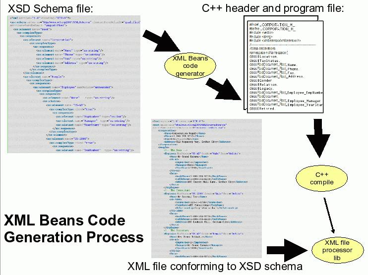 The XmlBeansxx program and process is a C++ code generation program driven by an XSD XML schema definition. XmlBeansxx can read an XSD schema definition and auto-generate C++ classes to parse and access an XML file which meets the schema definition. The very same classes can also be used to generate XML conforming to the XSD schema. XmlBeansxx will generate C++ classes and provide a library which can be compiled in or linked into your C++ program. There are functions in these classes which can be used to obtain values from a parsed XML file or to generate an XML file. XML validation is optional.