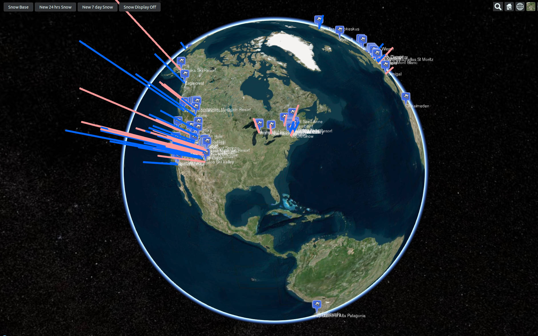 | Cesium: | Home Page: https://cesium.com/ Demos: https://cesiumjs.org/demos/ (Example snow data display: Global snow reports) Source: https://cesiumjs.org/downloads/ |