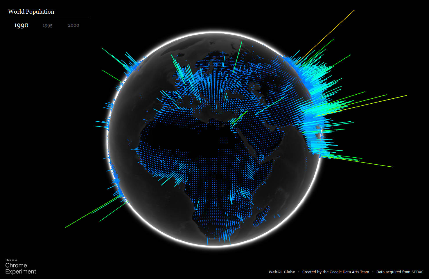 | Google Chrome Experiments: Globe | Experiments: https://globe.chromeexperiments.com/ Globe: https://experiments.withgoogle.com/chrome/globe Source: https://github.com/dataarts/webgl-globe |