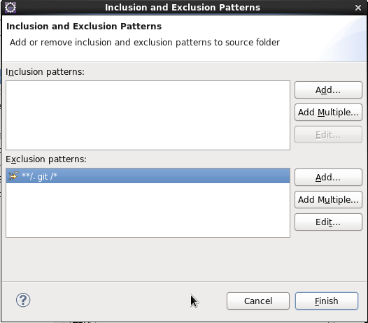 - In the lower half under "Exclusion patterns:" select "Add..." and enter the pattern **/.git/*