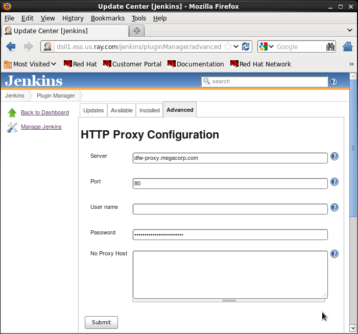 • Edit proxy setting is proxy config file: JENKINS_HOME/proxy.xml