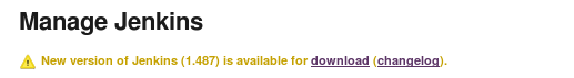 • Jenkins updates: Jenkins will notify you of Jenkins software updates and allow you to download a new Jenkins WAR file. You will get an update message similar to the one below: