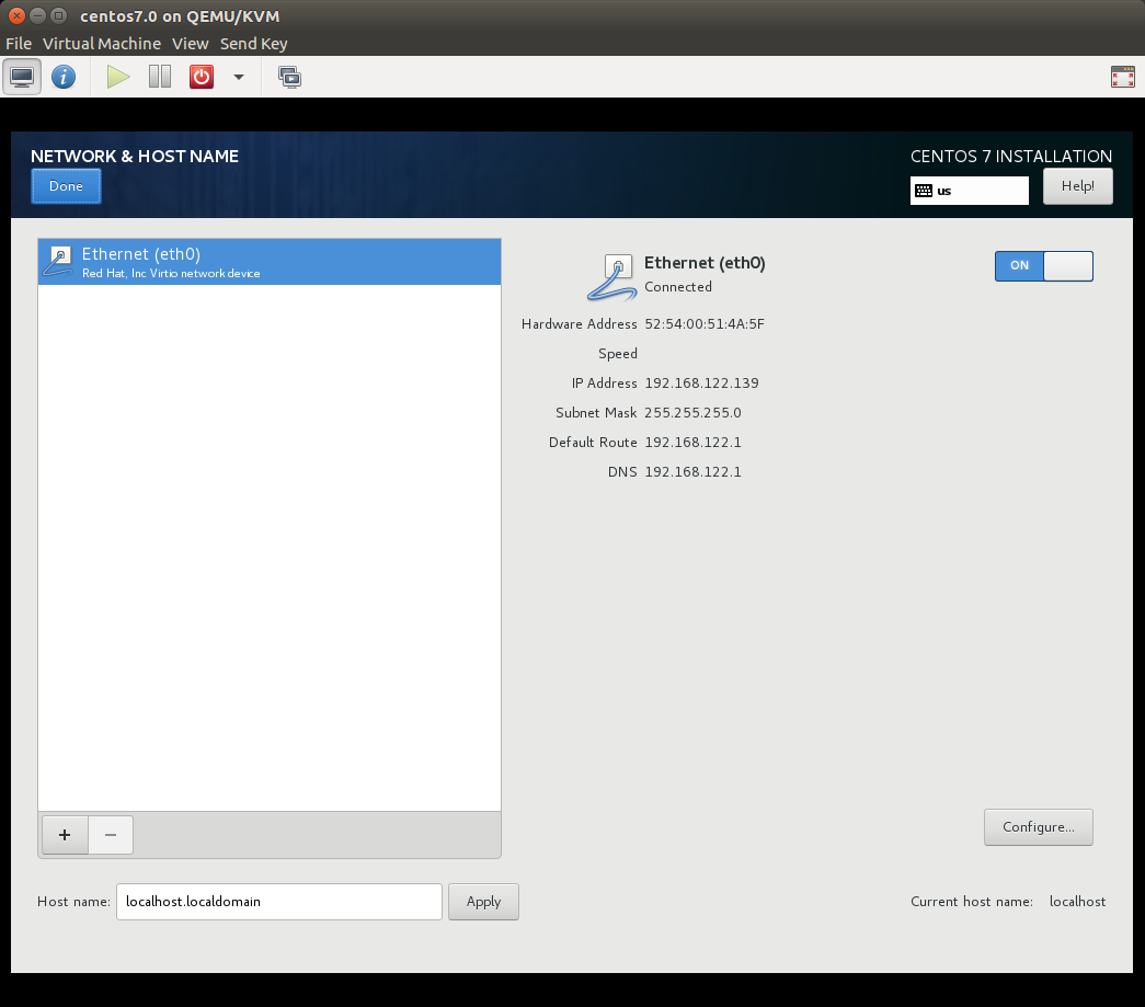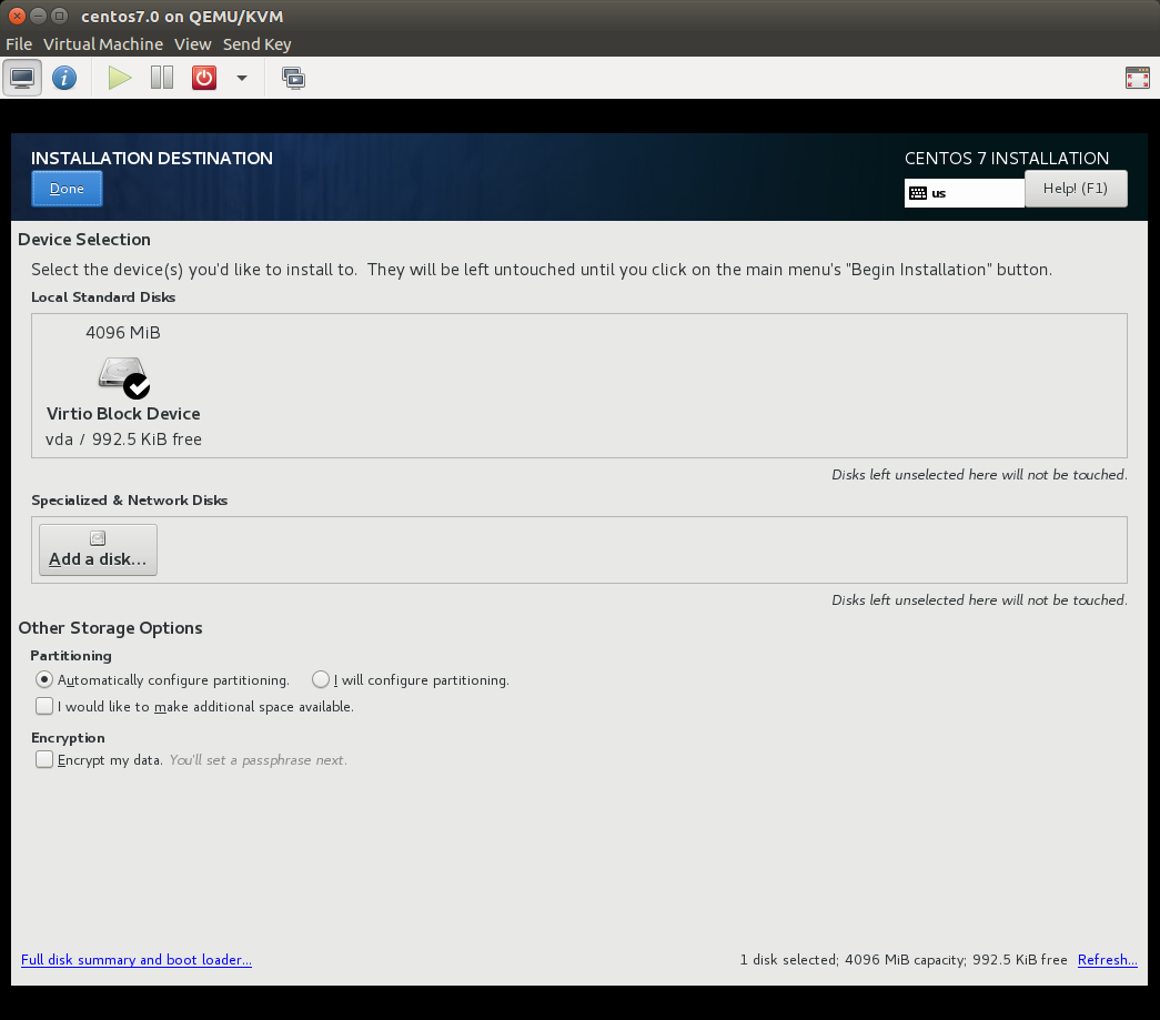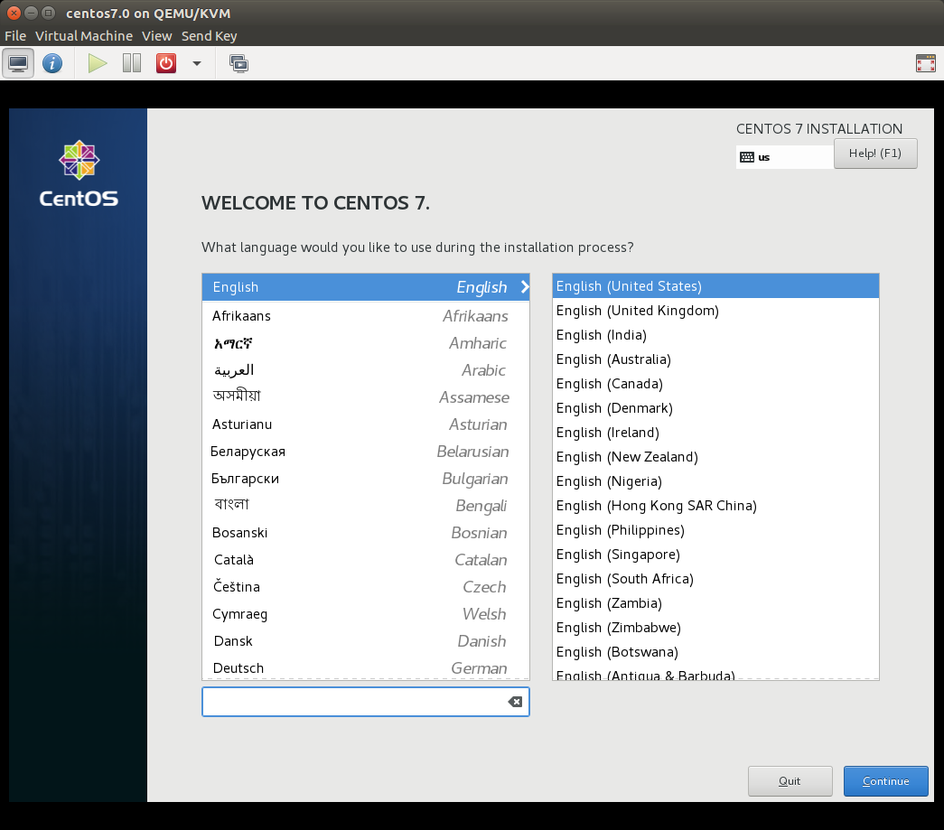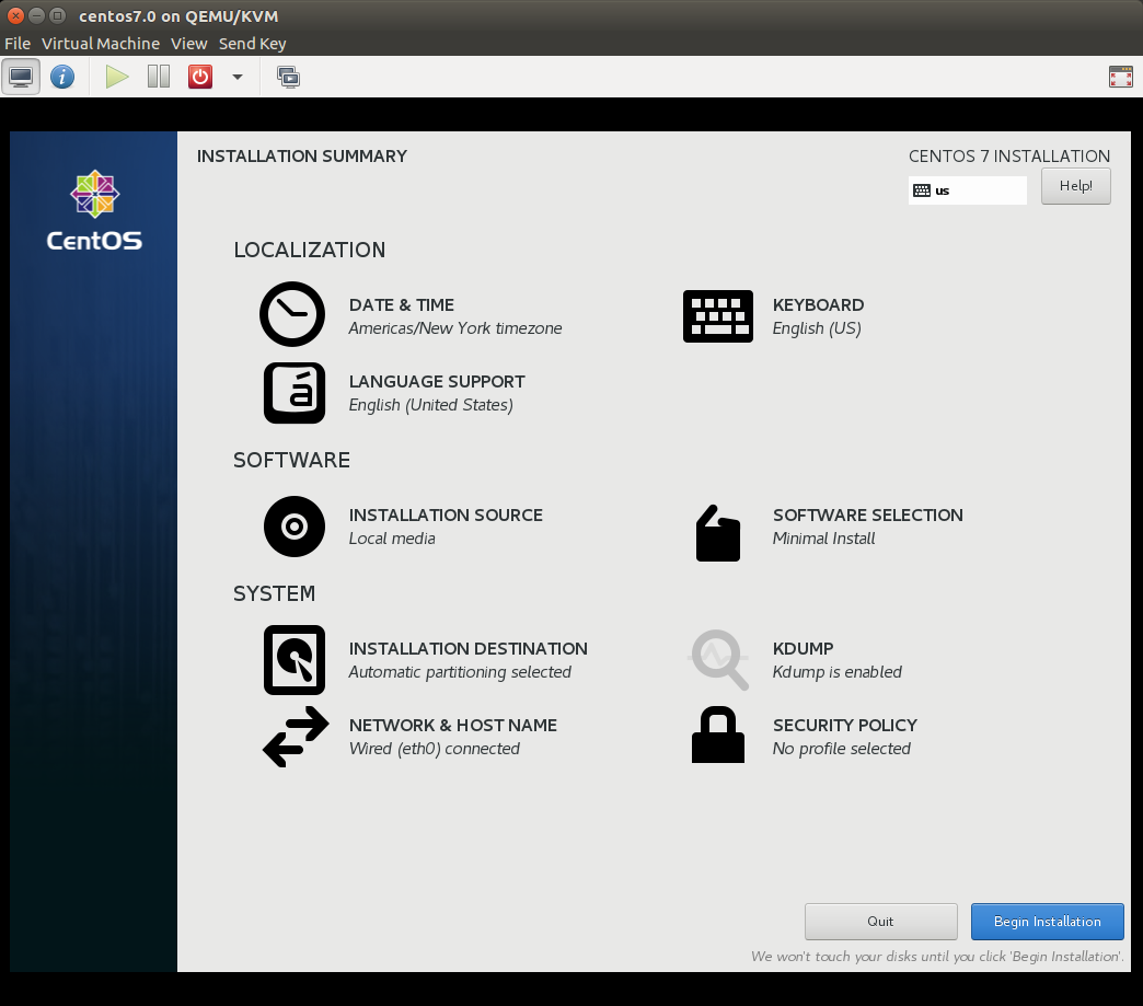 Example installation of a downloaded Linux ISO CentOS-7-x86_64-Minimal-1708.iso, installed to a new guest VM instance with 2GB ram and 4GB disk on an Ubuntu 16.04 host.