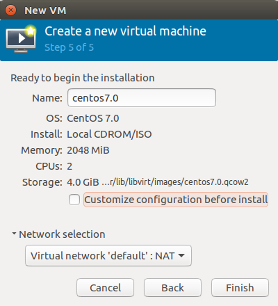# qemu-img info /var/lib/libvirt/images/centos7.0.qcow2 image: /var/lib/libvirt/images/centos7.0.qcow2 file format: qcow2 virtual size: 4.0G (4294967296 bytes) disk size: 1.1G cluster_size: 65536 Format specific information: compat: 1.1 lazy refcounts: true refcount bits: 16 corrupt: false - Open a GUI console to the VM: virt-viewer 51162b9b-c74d-4467-8a6e-6964f8cacac7