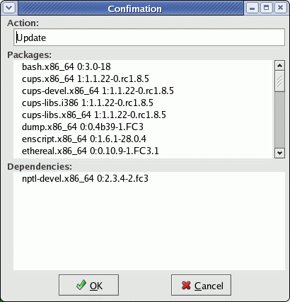 # yum -y update Setting up Update Process Setting up Repos base 100% |=========================| 1.1 kB 00:00 updates-released 100% |=========================| 951 B 00:00 Reading repository metadata in from local files base : ################################################## 2852/2852 primary.xml.gz 100% |=========================| 367 kB 00:02 MD Read : ################################################## 927/927 updates-re: ################################################## 927/927 Excluding Packages in global exclude list Finished Resolving Dependencies --> Populating transaction set with selected packages. Please wait. ---> Downloading header for mod_dav_svn to pack into transaction set. mod_dav_svn-1.1.4-1.1.x86 100% |=========================| 8.9 kB 00:00 ---> Package mod_dav_svn.x86_64 0:1.1.4-1.1 set to be updated ---> Downloading header for initscripts to pack into transaction set. initscripts-7.93.7-1.x86_ 100% |=========================| 87 kB 00:00 ---> Package initscripts.x86_64 0:7.93.7-1 set to be updated ---> Downloading header for gtk2 to pack into transaction set. ... ... --> Running transaction check Dependencies Resolved Transaction Listing: Install: aqhbci.x86_64 0:1.0.2beta-0.fc3 - updates-released Install: aqhbci-devel.x86_64 0:1.0.2beta-0.fc3 - updates-released Install: kernel.x86_64 0:2.6.11-1.14_FC3 - updates-released ... ... Performing the following to resolve dependencies: Install: aqbanking-devel.x86_64 0:1.0.4beta-0.fc3 - updates-released Install: gwenhywfar-devel.x86_64 0:1.7.2-0.fc3 - updates-released Total download size: 431 M Downloading Packages: (1/168): mod_dav_svn-1.1. 100% |=========================| 54 kB 00:00 (2/168): initscripts-7.93 100% |=========================| 1.1 MB 00:03 ... ... Running Transaction Test Finished Transaction Test Transaction Test Succeeded Running Transaction Updating: libgcc 100 % done 1/333 Updating: libgcc 100 % done 2/333 ... ... Completing update for mod_dav_svn - 169/333 Completing update for initscripts - 170/333 Completing update for gtk2 - 171/333 ... ... Installed: aqhbci.x86_64 0:1.0.2beta-0.fc3 aqhbci-devel.x86_64 0:1.0.2beta-0.fc3 kernel.x86_64 0:2.6.11... Dependency Installed: aqbanking-devel.x86_64 0:1.0.4beta-0.fc3 gwenhywfar-devel.x86_64 0:1.7.2-0.fc3 Updated: ImageMagick.i386 0:6.2.0.7-2.fc3 ImageMagick.x86_64 0:6.2.0.7-2.fc3 ImageMagick-c++.i386 ... ... ... Obsoleted: openhbci.x86_64 0:0.9.17-1 openhbci.i386 0:0.9.17-1 openhbci-devel.x86_64 0:0.9.17-1 Complete! #[Potential Pitfall]: Many times I have found that I can get the following errors: