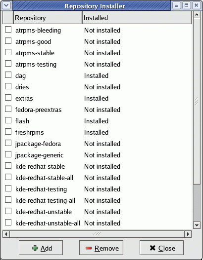 - Add: RpmForge.org (add by installing RPM with RpmForge configuration: rpmforge-release-xxxx.rpm)