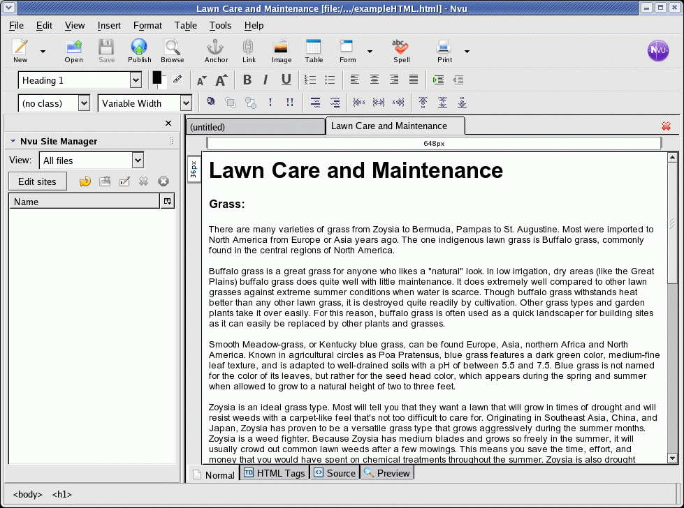 Kompozer:Easy to use WYSIWYG GUI HTML editor. Loads of features. Was renamed from "nvu".