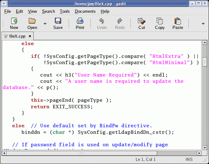 gedit: This is the default text editor for the Linux Gnome desktop. It supports syntax highlighting, printing, a variety of plug-ins, multi-language spell check, tabbed for multiple files, etc.