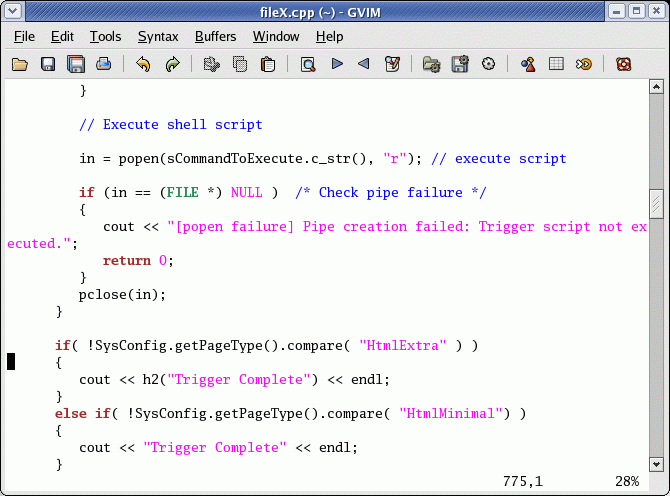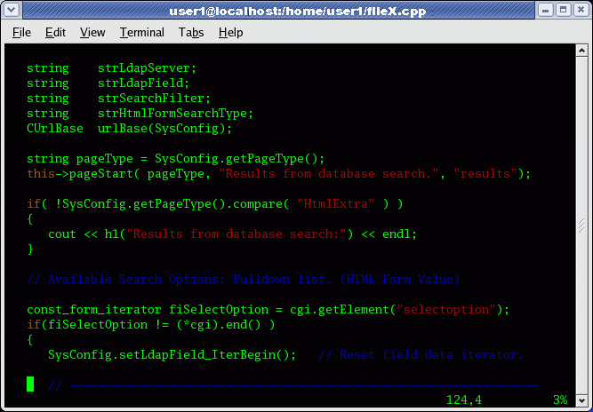 ![]() | vim: This console based plain text editor supports syntax highlighting and numerous plug-ins for specialized configurations and features. This editor is ubiquitous and available on all Linux systems and is the "standard" Linux editor. While it is not intuitive and has a learning curve, it is worth learning if Linux is part of your career or future.Also see the YoLinux.com vim tutorial. |