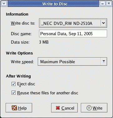 DVDs allow for greater storage capacity. They are also different from CDs in that they must first be formatted. The growisofs command will perform this task automatically if it detects that the DVD is unformatted. The DVDs in these examples are burned DAO (Disk At Once).