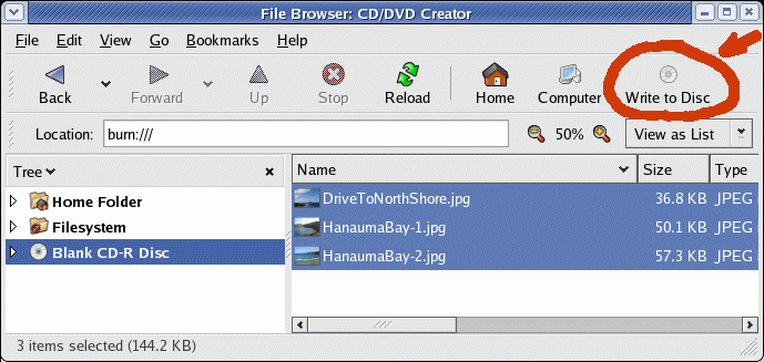 [Potential Pitfall]: When the blank CD is inserted into the drive, Nautilus should start with a CD showing no contents. If the contents from the last burn remail listed, select them and press the "delete" key to remove the listing. - Select the "Write to Disc" button.