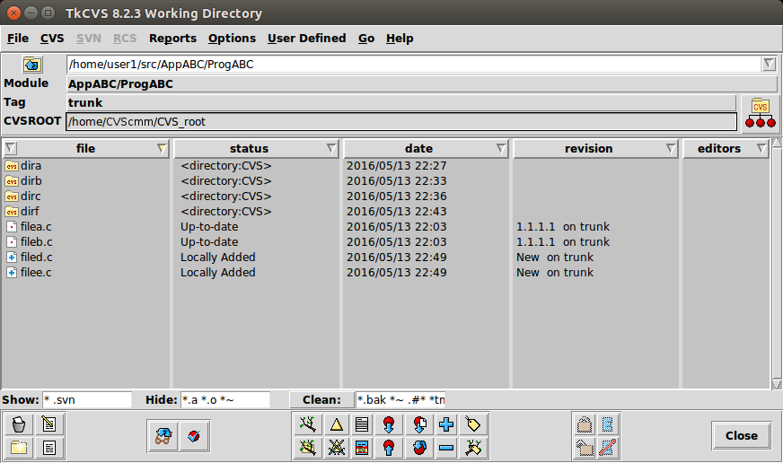 TkCVS is a Tcl/Tk-based graphical front-end to CVS (and Subversion and RCS). It includes TkDiff for file diffs and merges. TkCVS is used for tagging, merging, importing, exporting, checking in/out, file query and status of CVS managed files.