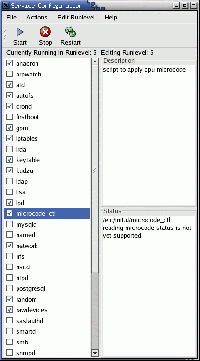 The (Red Hat/Fedora/IRIX) chkconfig command generates and breaks links between the directory /etc/rc.d/init.d/ and the appropriate run level directory: /etc/rc.d/rc[0-6].d/ to control boot process initiation and process shutdown.