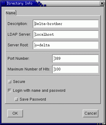 [Potential Pitfall]: Some versions of Netscape will attempt to bind using the "User ID" and "Password" of NULL even if you enter values for these fields. This discovery was made using the Ethereal packet sniffer to diagnose problems I was having. I was using Netscape 4.77. (Red Hat Bugzilla: BUG# 55604)
