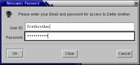 Netscape Address Book: When binding using Netscape Messenger use the "User ID:" fratbrother and "Password:" fratsecret. This is different than the LDAP Bind described above. I am assuming that Netscape employs the "Server Root" to generate the LDAP DN. The dialog box asks you to enter your Email address. This is because the Netscape Messenger LDAP DN uses the email address. This message can be ignored.