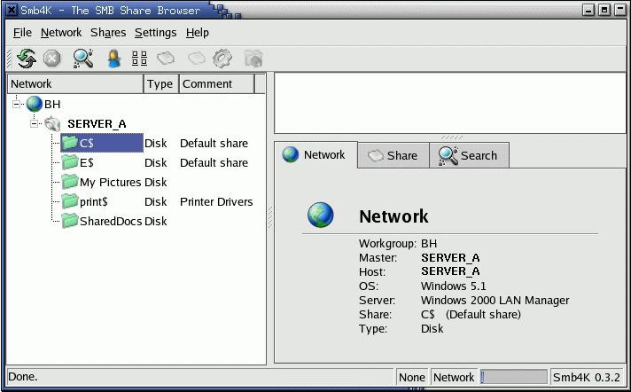 Scan for active workgroups, hosts and shares, mount/unmount, access files (using Konqueror), printer shares, ...