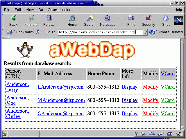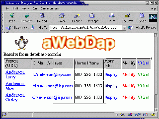aWebDap is a CGI executable which provides a friendly web front-end to an LDAP database for users and administrators. The aWebDap system is comprised of three files, (1) an executable which can be placed in your "/cgi-bin/" directory, (2) an HTML form to interface with the CGI, and (3) the configuration file /etc/awebdap.conf. The power and flexibility of aWebDap comes from the configuration file which presents many options to the user from a fully featured web presentation for web browsers and a low weight presentation for PDA and cell phone web access. Awebdap also supports https secure connections.