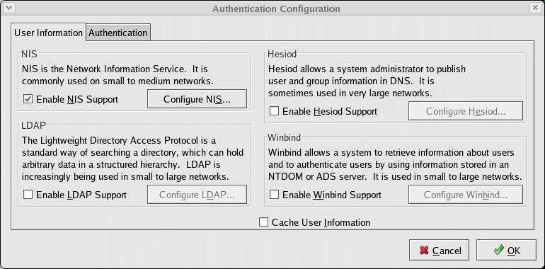 - nscd - Handles password and group lookups and caches the results. Used by LDAP and NIS. Configuration of nscd defines which files are supported by NIS. i.e. authentication requires passwd, shadow and group file support. Uses configuration file /etc/ncsd.conf
