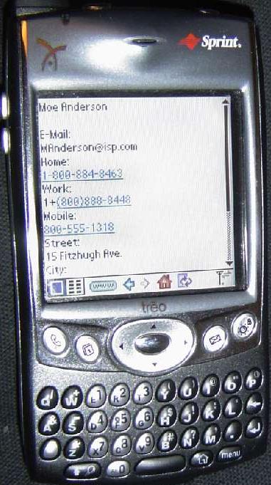 Search results displayed on a Handspring Treo 600. (The Treo can also detect phone number sequences and create a link by which you can dial the number.) |